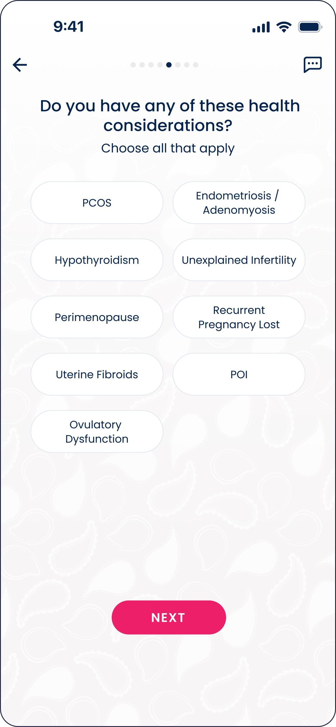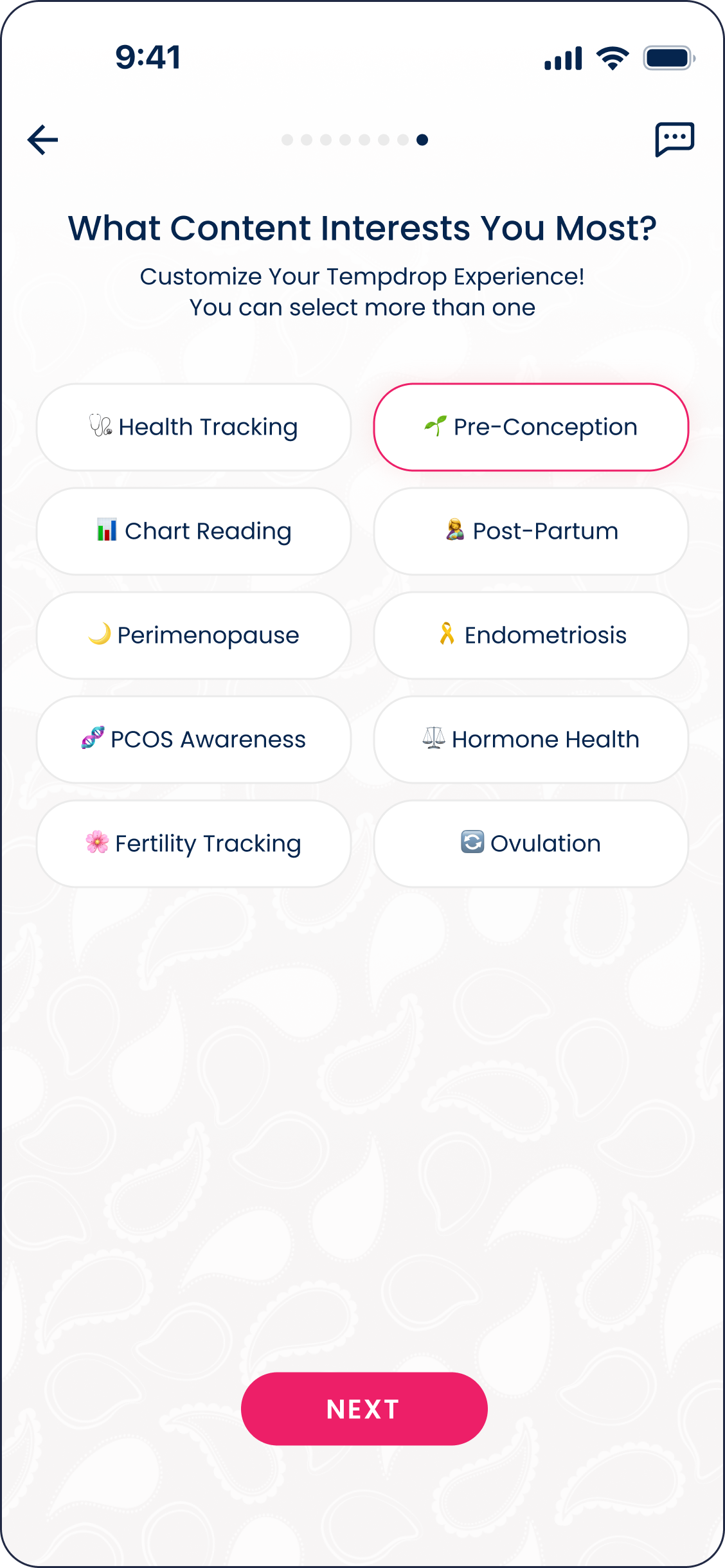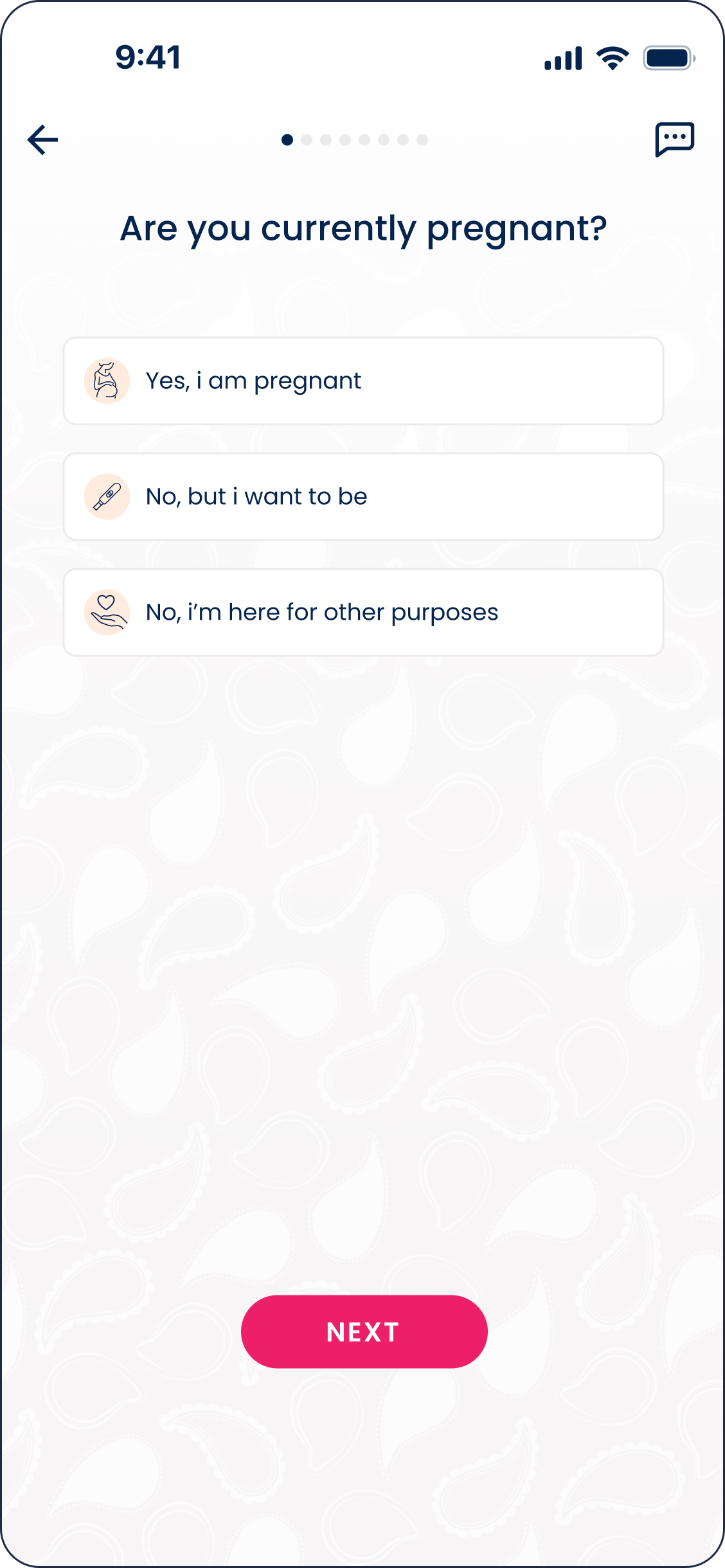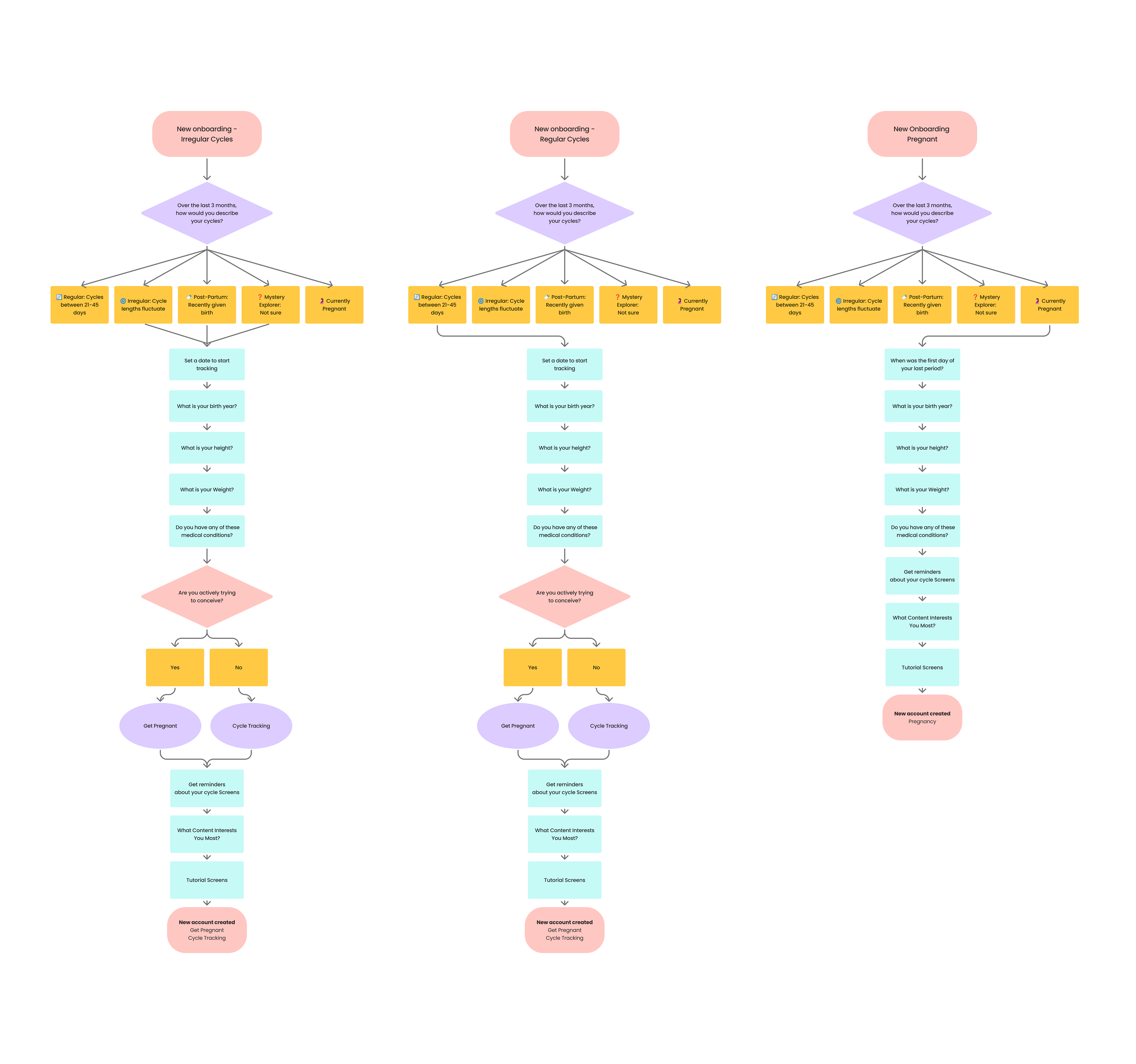 Previously, users had to choose between three predefined purposes of use, including Practice Fertility Awareness (PFA). In the redesigned flow, guided questions help identify the most relevant purpose based on the user’s goals. The app then presents one of three paths — Pregnancy, Get Pregnant, or Fertility Tracking — while still allowing users to switch modes later in the settings.